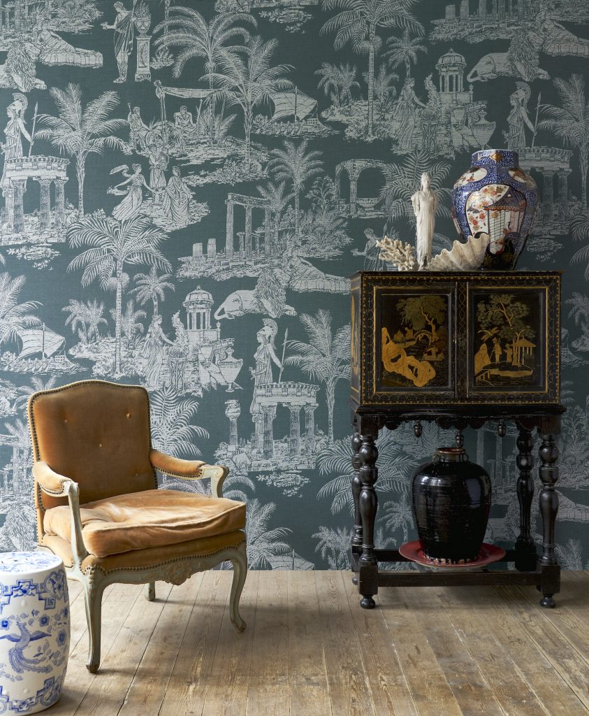 This unusual wallcovering in woven jute takes you back to the rich past of the Greeks with stately temples and mysterious myths. The monochrome design is inspired by the well-known romantic style of Toile de Jouy.